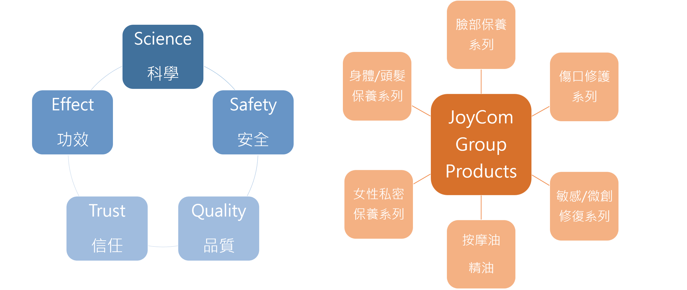 JoyCom Group 提供給消費者的是 【 以實證科學研究 ( Science ) 為基礎,兼具高功效 ( Effect ) 及高安全 ( Safety ),並能深得使用者信任 ( Trust ) 的高品質 ( Quality ) 產品 】 ,在具備這五大核心元素下的傷口照護及化妝保養品-即為我們引以為榮的樂業集團產品 JGP ( JoyCom Group Products )。
