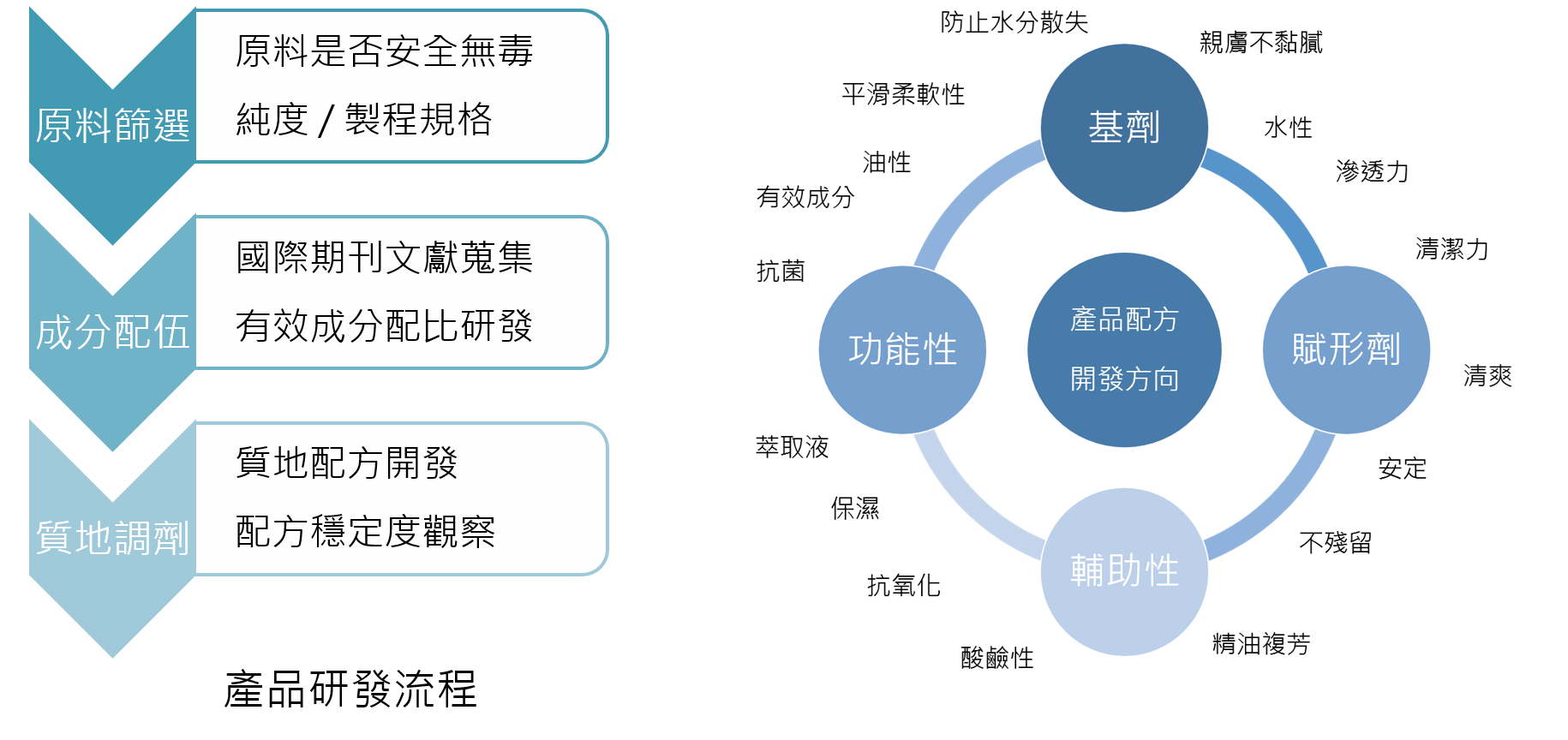 「原料篩選」是產品開發流程中最初,卻也是最重要的環節,原料的優良與否是決定產品好壞的關鍵;由大學教授領導的團隊會先從龐大的文獻資料庫中嚴格篩選、評讀,並進行系統性的綜合分析,謹慎地挑選適合產品屬性的原料,作為產品開發的依據;而在取得原料的過程中,亦設立一套嚴格的檢驗標準來確保品質,因為原料中的不純物質,經常是引起過敏的元兇。為確保產品之安全與有效性及使用時的質感,接著會進行「成分配伍」與「質地調劑」之研發,最後於產品上市前依產品特性進行相關之臨床研究或監測。JoyCom Group嚴謹的研發流程是優質產品的保證。