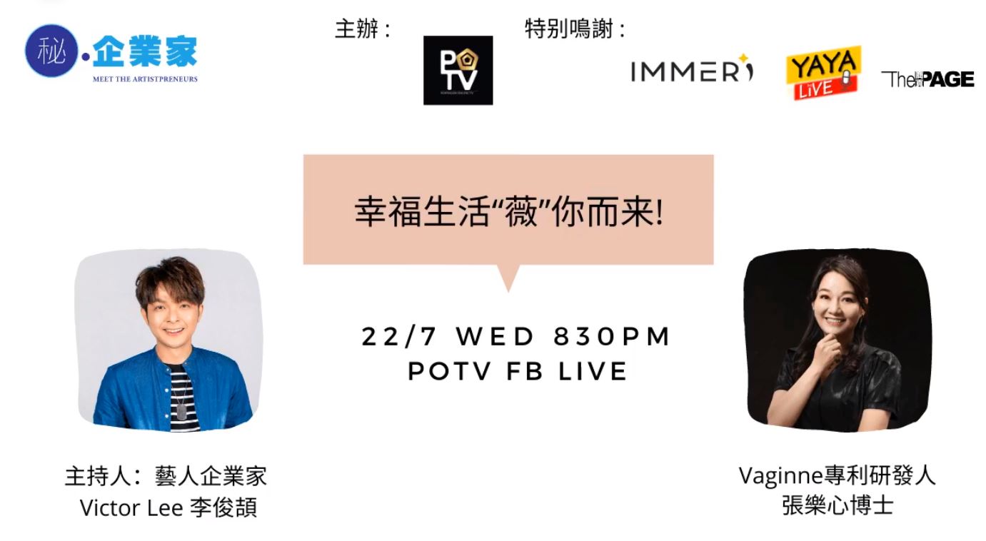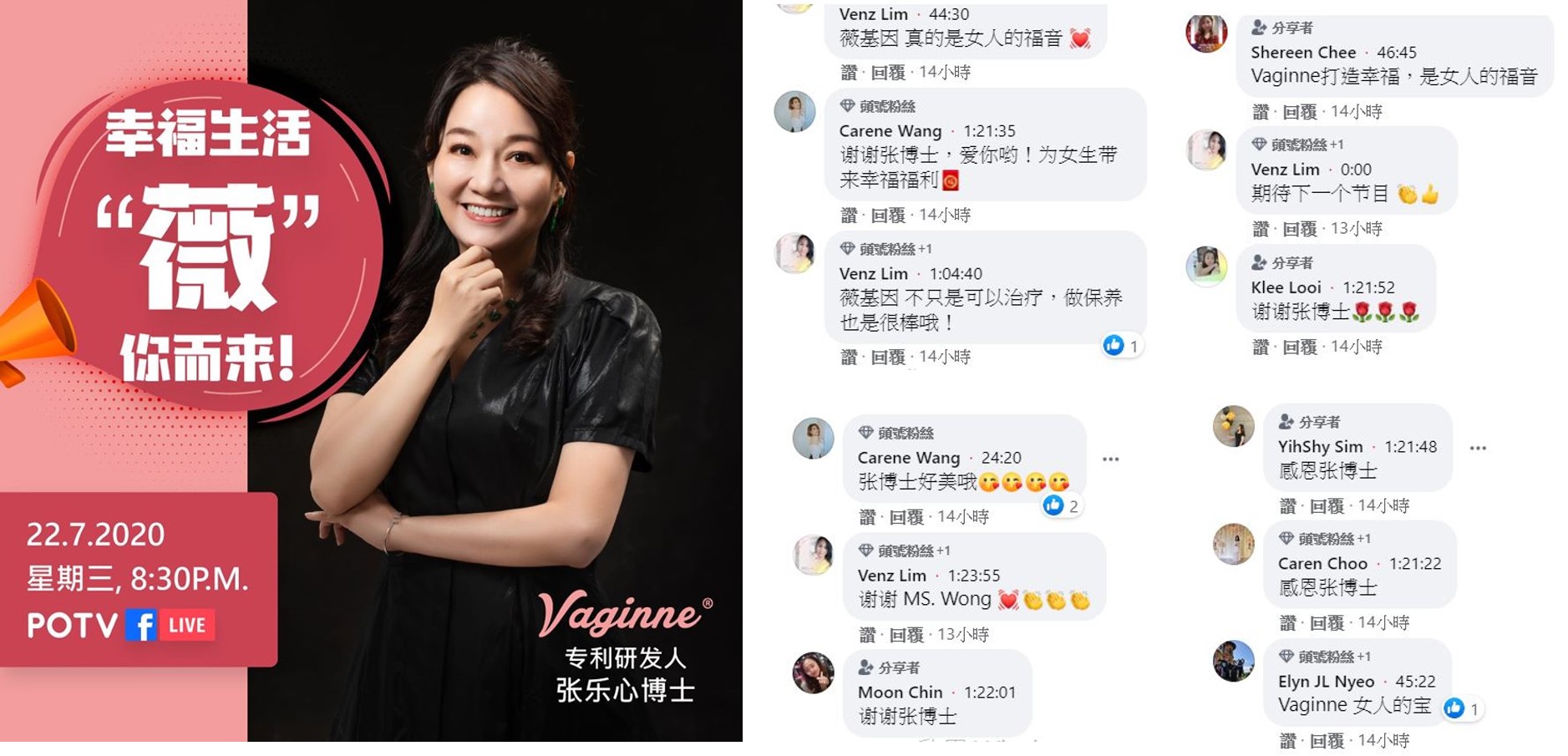 非常感謝POTV主持團隊特別邀請Vaginne私密專利發明人 — 張樂心 博士,深入了解薇基因凝膠產品原理、作用機轉及優勢,並說明女性私密處相關保養知識,直播互動反應熱烈,期待本次線上專訪能讓更多女性擁有健康的幸福生活。