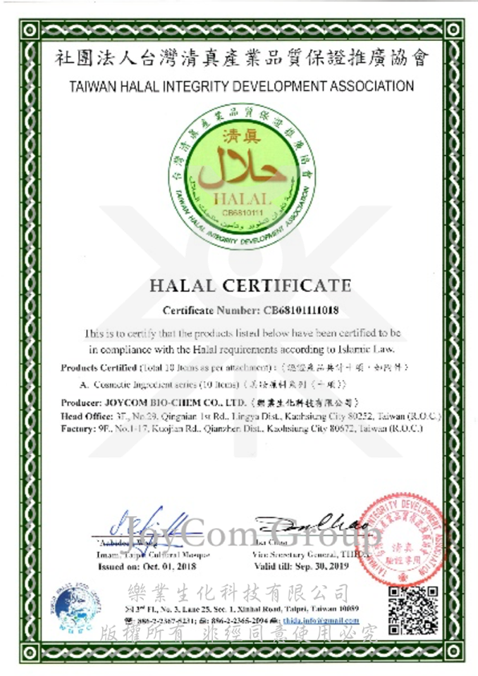 消費者的聲音Joycom Group 樂業集團聽到了!我們將集團旗下研發的專利原料,送至清真認證協會檢驗。十分高興,由樂業集團研發的數十項專利原料,獲得了清真協會的認可,並售予我們『清真認證證書』!