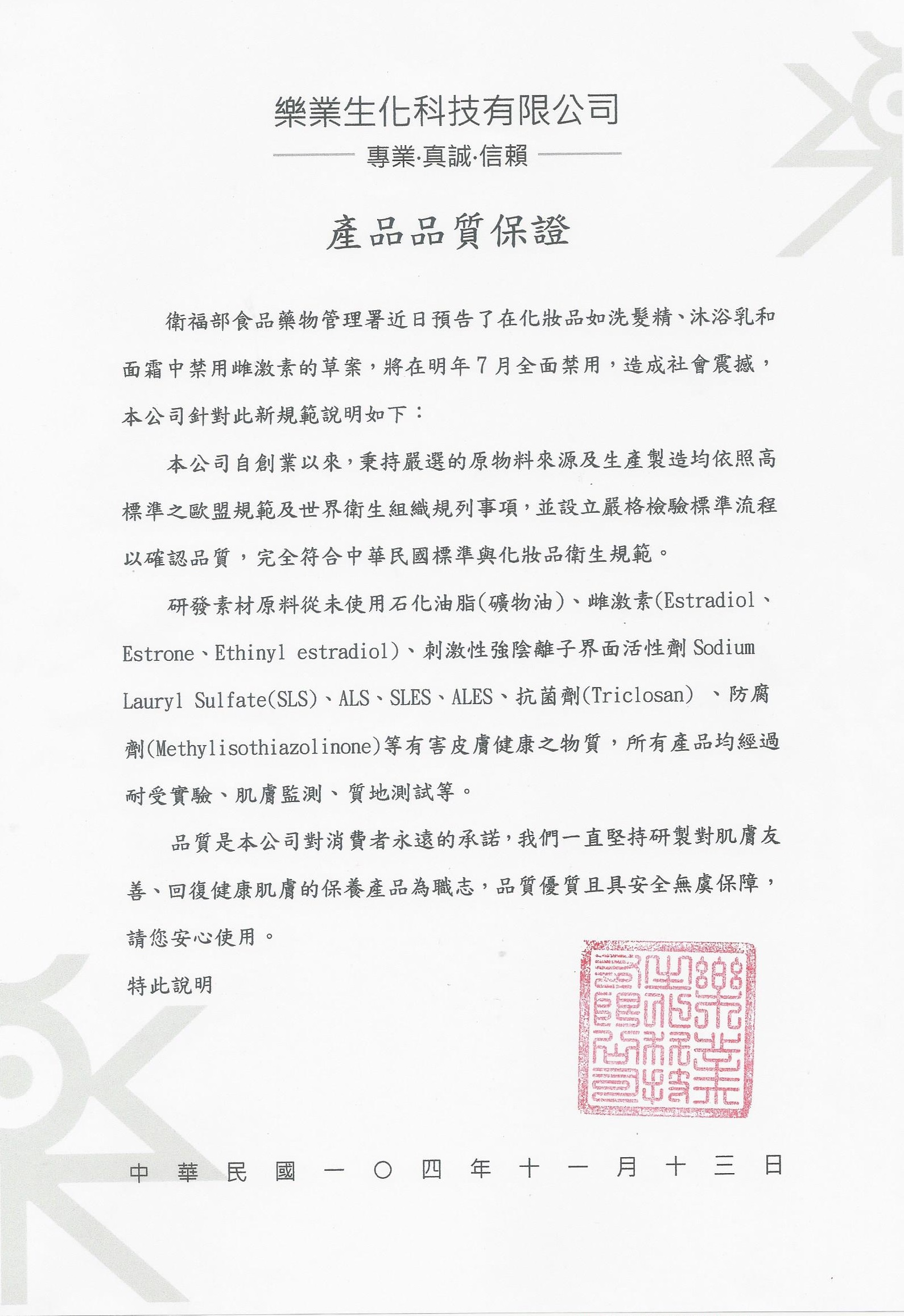 樂業產品安全聲明書