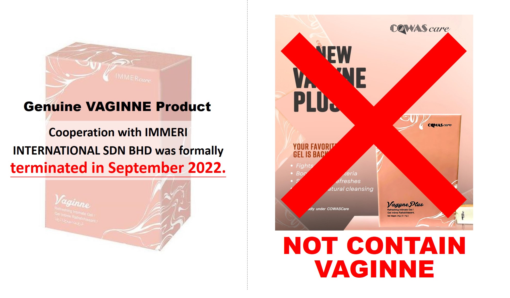 IMMERI INTERNATIONAL SDN BHD was formerly a business partner of the VAGINNE brand; however, the cooperation was formally terminated in September 2022.